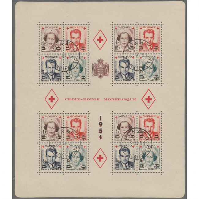 Foglietto Croce Rossa di Monaco del 1951. Francobolli del 1949 Croce Rossa soprastampati con nuovo valore. Emessi in foglietto comprendenti 4 serie in blocco di 4 francobolli. Foglietto usato.