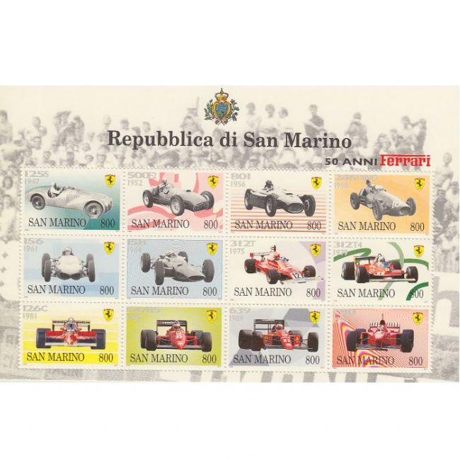 Foglietto emesso dalla Repubblica di San Marino per il 50° anniversario della Ferrari il 1998. Il foglietto è composto da 12 francobolli ognuno dei quali raffigura una macchina Ferrari delle varie epoche. Formato del foglietto 180x115.