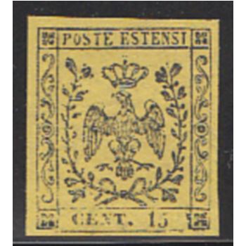 15 centesimi emesso dal Ducato di Modena nel 1852, nel riquadro del francobollo Aquila estense sormontata dalla corona ducale, stampa tipografica in nero su carta colorata senza filigrana. I francobolli furono introdotti a seguito della convezione postale austro-estense del 29 ottobre 1851 con cui anche Modena aderiva alla Lega postale austro-italica, con servizi e tariffe unificati per tutti i paesi aderenti.