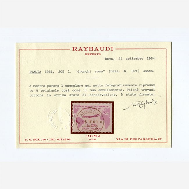 Il francobollo in perfetto stato come il suo timbro in posizione ideale, è annullato con bollo Milano Filatelico 6.IV.61. Il francobollo Gronchi Rosa usato, una delle maggiori rarità della repubblica, è fornito di 2 certificati di autenticità di: Raybaudi e Diena.