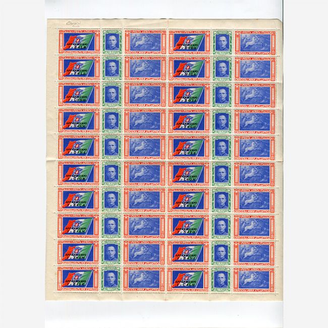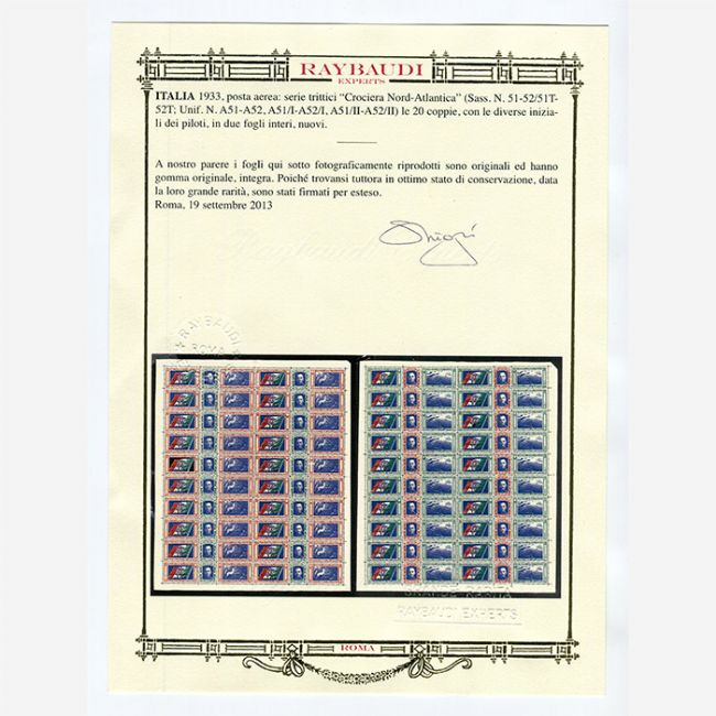 Regno d'Italia 1933, francobolli di posta aerea, serie completa trittici Crociera Nord Atlantica, le 20 coppie dei piloti in due fogli interi nuovi, correlati di certificato Oro Raybaudi. I soggetti del primo trittico: la bandiera con sovrastampa della sigla dell'apparecchio, effigie di Vittorio Emanuele III e il carro del Sole da un tondo dell'Arco di Costantino a Roma, nel secondo trittico: la bandiera Italiana con sovrastampa della sigla dell'apparecchio, effigie di Vittorio Emanuele III e idrovolanti in volo tra il Colosseo e i grattacieli di Chicago. Ogni trittico è costituito da un'etichetta di raccomandazione-espresso recante la sigla in nero di uno degli apparecchi, di un francobollo da L.5,25 (tariffa raccomandata espresso per l'estero) e del valore di posta aerea (sopratassa fissata per l'occasione). I 20 trittici che compongono il foglio si differenziano per la sigla dell'idrovolante (le prime lettere del nome del pilota) su cui doveva viaggiare la corrispondenza affrancata con quel trittico.