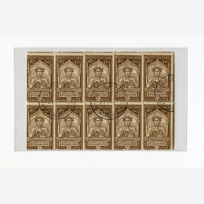 Regno d'Italia, la serie fu emessa per il 6° centenario della morte di Dante Alighieri, blocco di otto francobolli usati della serie composta dai valori 15-25-40 centesimi, anno 1921. I soggetti dei francobolli: il 15 c. aquila e Divina Commedia - 25 c. Italia Turrita e bandiera - 40 c. il Poeta.