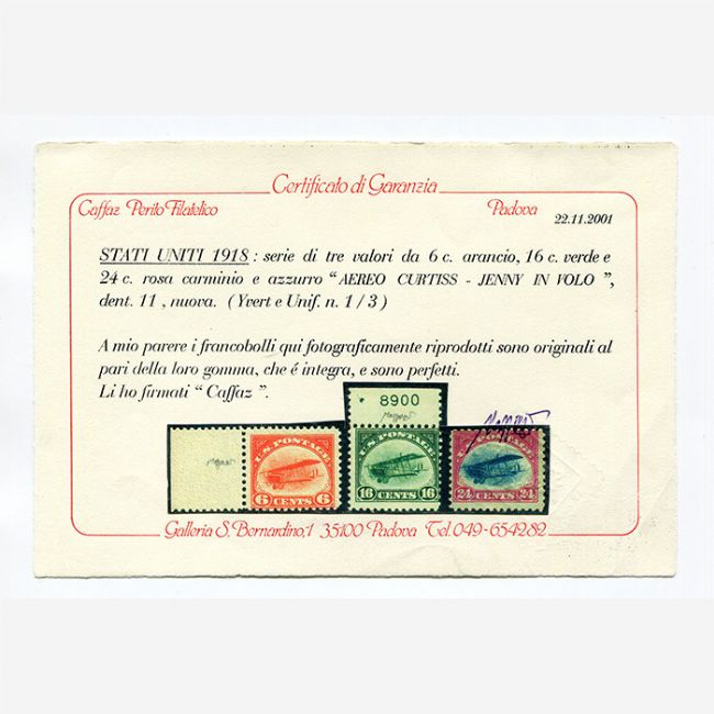 Stati Uniti 1918, serie di tre francobolli, valori da 6 c. arancio, 16 c. verde e 24 c. rosa carminio e azzurro "AEREO CURTIS - JENNY IN VOLO".Dent. 11, la serie di francobolli ha gomma nuova intergra. Certificato di autenticità del Perito Filatelico CAFFAZ.