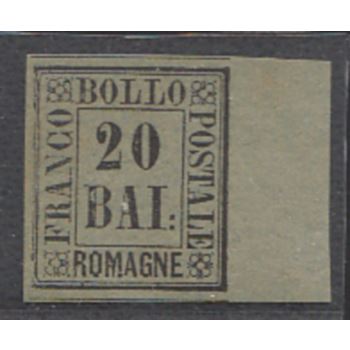Francobollo da 20 bai Romagne emesso nel 1859, nel riquadro del francobollo indicazione del valore in una cornice rettangolare. Francobollo non dentellato su stampa tipografica. Nel 1859 le cosiddette Legazioni Pontificie (Bologna, Ferrara, Ravenna e Forli') si ribellarono al Governo Pontificio approfittando della partenza delle truppe austriache che le presidiavano. Il Governo provvisorio decise subito l'emissione di propri francobolli.