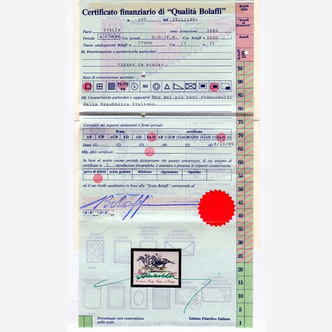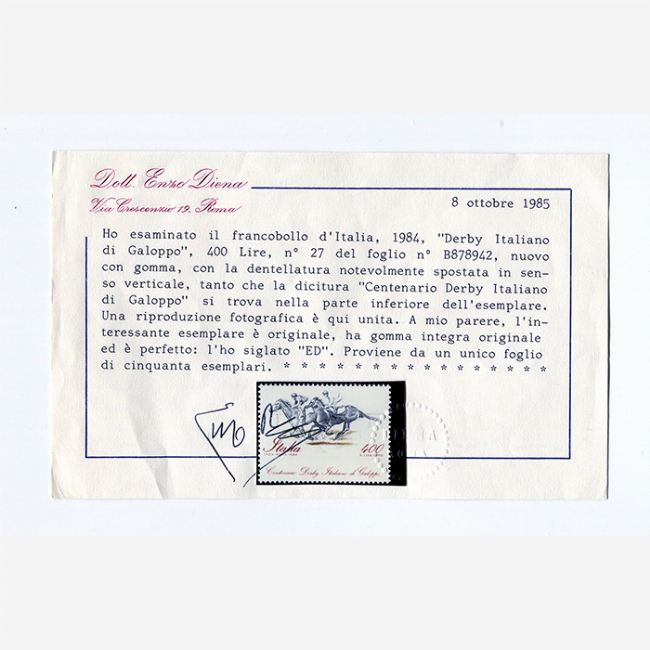 Repubblica Italiana, Varietà di emissione sul francobollo d'Italia 1984 "Derby Italiano di Galoppo", 400 Lire, n° 27 del foglio n° B878942, francobollo nuovo con dentellatura notevolmente spostata in senso verticale tanto che la dicitura "Centenario Derby Italiano di Galoppo" si trova nella parte inferiore dell'esemplare. Uno dei francobolli più rari della Repubblica Italiana. Il francobollo e' correlato di 2 Certificati di autenticità, Bolaffi-Enzo Diena.