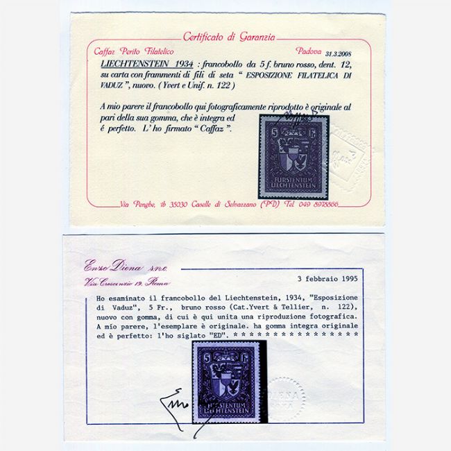 Liechtenstein 1934,francobolli da 5 Fr. bruno rosso, dentellatura 12, su carta con frammenti di fili di seta "ESPOSIZIONE FILATELICA DI VADUZ". Francobollo nuovo con gomma integra, correlato di certificato di garanzia CAFFAZ. e ENZO DIENA.