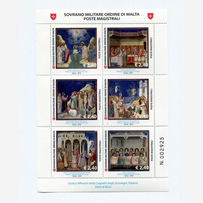 Ufficio filatelico del Sovrano Militare Ordine di Malta, serie cicli pittorici, storie di Gesù, Giotto, affresco della Cappella degli Scrovegni a Padova, anno di emissione 2019. Per la tematica dedicata ai cicli pittorici questo foglietto composto da sei francobolli ha preso l'avvio con la raffigurazione degli affreschi di Giotto nella Cappella degli Scovegni a Padova. I francobolli raffigurano nell'ordine: Battesimo di Gesù, Nozze di Cana, Resurrezione di Lazzaro, Ingresso a Gerusalemme, Cacciata dei mercanti dal tempio, Ultima cena