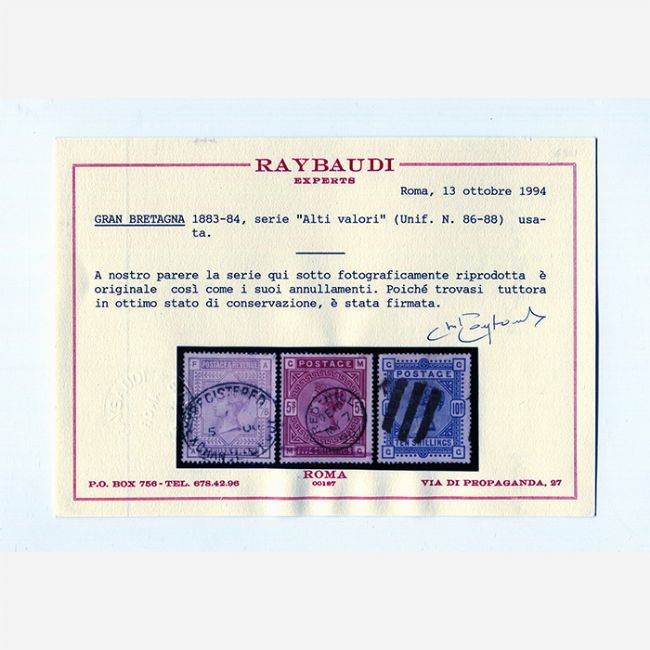 Francobolli Gran Bretagna anno 1883-1884, serie Alti Valori usata,(unificato n. 86-88)valori usati da 2/6 shillings - 5 shilligs - 10 shillings, la serie di francobolli è correlata da certificato di autenticità del perito Raybaudi.