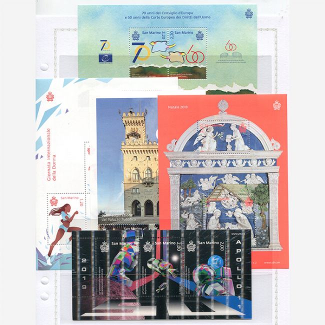 Annata completa di francobolli della Repubblica di San Marino anno 2019. Emissione filatelica di tutti i francobolli e foglietti commemorativi nuovi, emessi nell'anno 2019 dall'ufficio filatelico della Repubblica di San Marino, l'annata è composta dall'emissione di 21 valori e 6 foglietti.