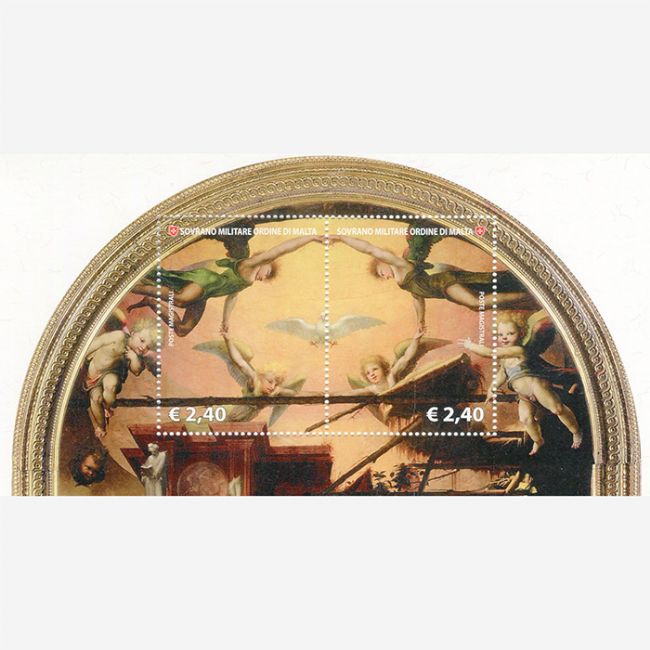 Emissione filatelica del Sovrano Militare Ordine di Malta (S.M.O.M.) per celebrare il natale con l'emissione dedicata alla Natività, anno 2020. Il foglietto che riproduce il dipinto di Domenico Beccafumi a Siena, chiesa di San Martino è composto dai valori di €.2,40+€.2,40 con particolare a dittico dello Spirito Santo sotto forma di colomba tra angeli festanti e il francobollo da €.2,60 con particolare del Bambino Gesù.