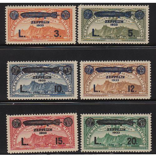Serie francobolli di posta area emessi dalla Repubblica di San Marino nel 1933 a commemorare la Crociera del dirigibile Graf Zeppelin. La serie è composta da sei francobolli ognuno dei quali ha la soprastampa del dirigibile con la scritta ZEPPELIN 1933 e il valore facciale. Serie nuova con gomma integra.