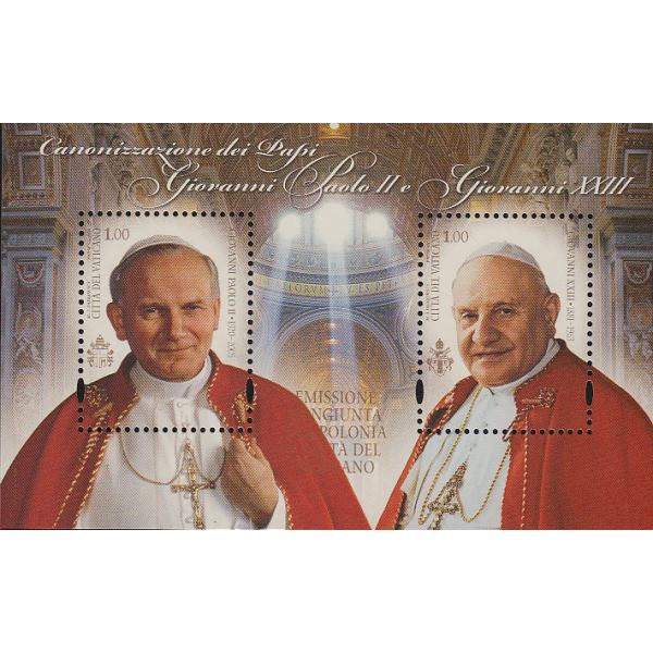 Francobolli stampati in foglietto emesso il 21 marzo 2013 dalla Città del Vaticano per la Canonizzazione di Papa Giovanni Paolo II e Papa Giovanni XXIII. Il foglietto composto da 2 francobolli ha come immagine i volti dei due Pontefici. Emissione congiunta con la Polonia.