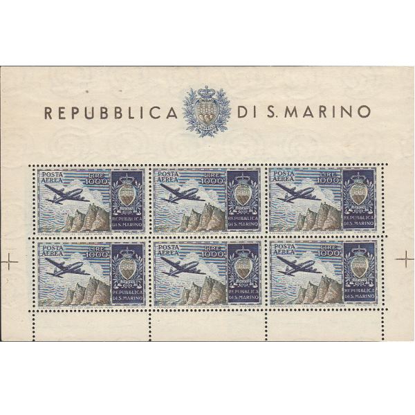 Francobolli stampati in foglietto emesso nel 1954 dalla Repubblica di San Marino. Il foglietto composto da 6 francobolli di posta aerea da 1000 lire hanno come immagine aereo e veduta con stemma al lato. Francobolli stampati su filigrana ruota. Foglietto nuovo con gomma integra.