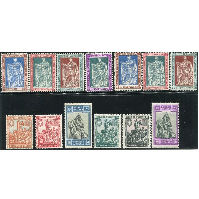Regno d'Italia 1928, serie filatelica "4° centenario della nascita di Emanuele Filiberto e 10° anniversario della Vittoria. Serie completa composta da 13 valori: 20/25/30/ centesimi e 5 lire dentellatura 11, il 20/25/30 centesimi dentellatura 13-3/4, il 50/75/ centesimi e il 1,25/1,75/10/20 lire dentellatura 14. Serie di francobolli con gomma integra.