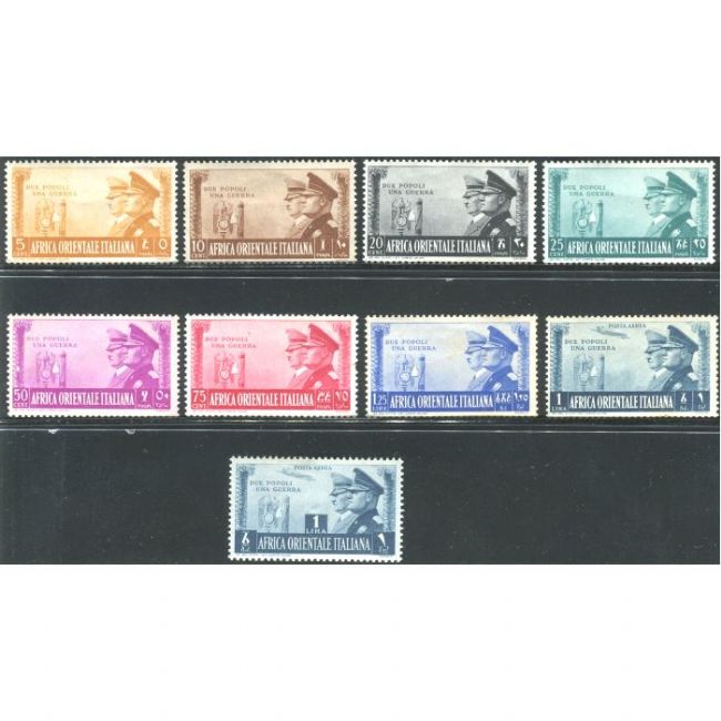 Colonie Italiane, Africa Orientale Italiana 1941, la serie di francobolli completa è composta da 7 valori di posta ordinaria: 5/10/20/25/50/75 centesimi, 1,25 lire, dal valore della Posta Aerea di 1 lira e dal valore non emesso da 1 lira con il valore al centro. La serie è nuova con gomma intergra.