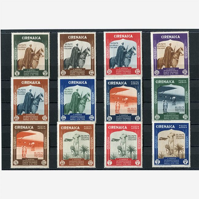 Colonie Italiane, Cirenaica, serie emessa il 16 ottobre 1934 per la 2^ Mostra Internazionale d'Arte Coloniale a Napoli. La serie completa è composta da i 6 valori ordinari e i 6 valori della posta aerea per un totale di 12 francobolli. I soggetti raffigurati nei francobolli sono per i valori della posta ordinaria:cavaliere arabo, mentre per i francobolli della posta aerea: per il 25,50, e 75C. sbarco dell'aereo, per il 80C, 1 e 2L. Venere di Cirene. Serie nuova con gomma integra, filigrana corona.