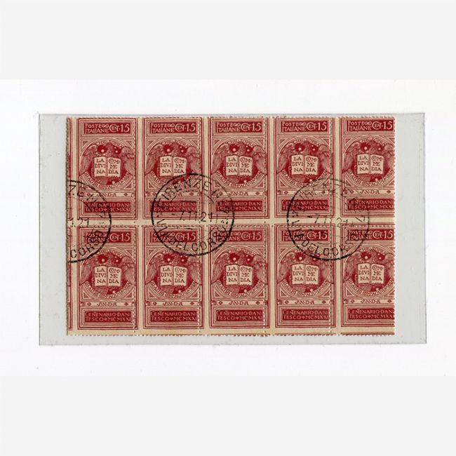 Regno d'Italia, la serie fu emessa per il 6° centenario della morte di Dante Alighieri, blocco di otto francobolli usati della serie composta dai valori 15-25-40 centesimi, anno 1921. I soggetti dei francobolli: il 15 c. aquila e Divina Commedia - 25 c. Italia Turrita e bandiera - 40 c. il Poeta.
