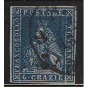 Francobollo da 6 crazie emesso nel 1851 dal Granducato di Toscana. Nel riquadro del francobollo leone coronato che regge lo scudo gigliato. L'introduzione dei francobolli fu attuata per effetto della convenzione postale con l'Austria del 5 novembre 1850, che creava una Lega postale austro - italica, con servizi e tariffe unificati in tutti i paesi aderenti.