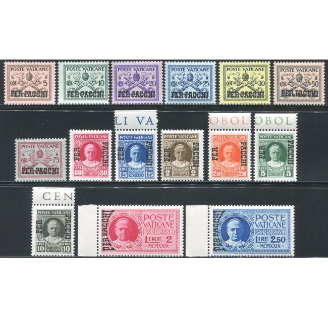 Città del Vaticano, pontificato di Pio XI, serie di francobolli Pacchi Postali 1931, francobolli della serie "Conciliazione del 1929 soprastampati". Serie completa composta da i valori: 5/10/20/25/30/50/75/80/ centesimi 1,25/2/2,50/5/10 lire, francobolli nuovi con gomma integra.