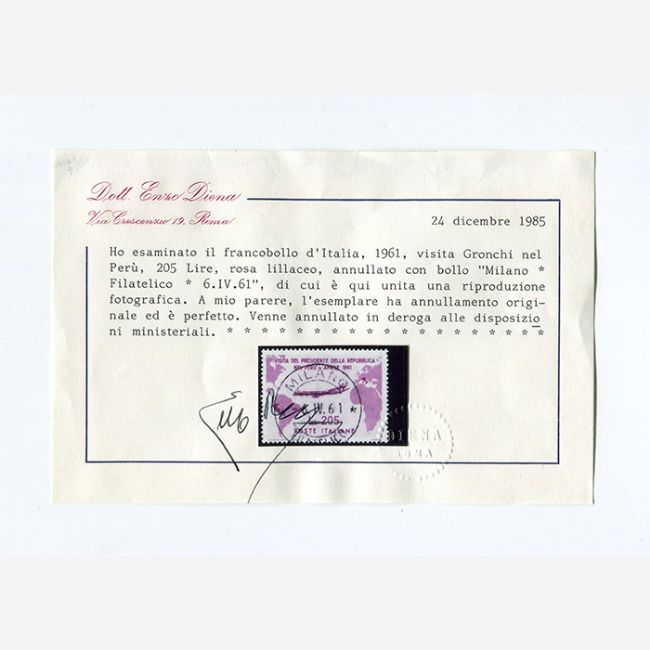 Il francobollo in perfetto stato come il suo timbro in posizione ideale, è annullato con bollo Milano Filatelico 6.IV.61. Il francobollo Gronchi Rosa usato, una delle maggiori rarità della repubblica, è fornito di 2 certificati di autenticità di: Raybaudi e Diena.
