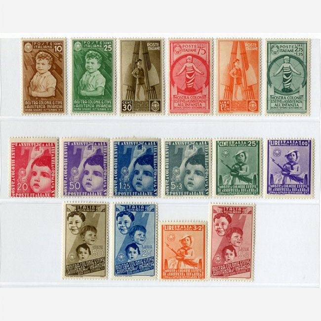Regno d'Italia, Vittorio Emanuele III, serie completa di francobolli ordinari e di posta aerea della Mostra delle Colonie estive e Assistenza all'Infanzia emessa il 28 giugno 1937. La serie tutta nuova con gomma integra è composta da 10 francobolli ordinari e 6 della posta aerea per un totale di 16 valori. Filigrana Corona.