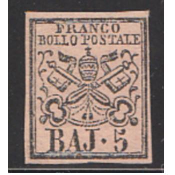 Francobollo da 5 baj emesso dallo Stato Pontificio nel 1852, nel riquadro del francobollo Stemma Pontificio (Tiara e Chiavi) e dicitura < Franco Bollo Postale >. Francobollo non dentellato. Anche lo Stato Pontificio entrò nella Lega postale austro - italica, ma a partire dal 1° ottobre 1852. In seguito all'occupazione italiana delle Marche e dell'Umbria, fino a 1° ottobre 1867 venne interrotto ogni rapporto postale con l'Italia, da entrambe le parti la posta doveva essere affrancata sino al confine, ma all'arrivo era tassata come non franca.