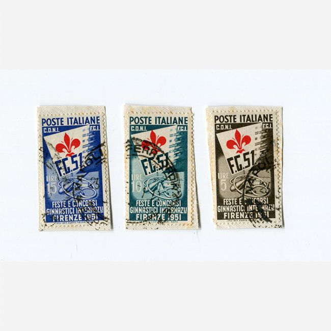 Repubblica Italiana, serie completa dei tre francobolli usati dei "Ginnici 1951" (feste e concorsi ginnastici internazionali a Firenze), emessi il 18.5.1951. I tre francobolli sono su altrettanti frammenti di busta annullata con bollo di Napoli Ferrovia il 25 giugno 1951. La serie e correlata di certificato di autenticità del perito filatelico Chiavarello.
