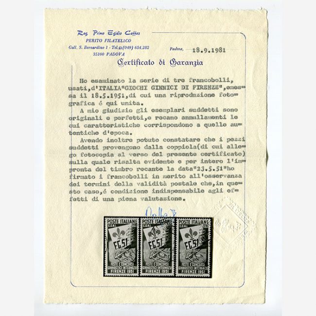 Repubblica Italiana, serie completa dei tre francobolli usati dei "Ginnici 1951" (feste e concorsi ginnastici internazionali a Firenze), emessi il 18.5.1951. Su i tre francobolli risalta l'impronta del timbro recante la data 23.5.51. La serie e correlata di certificato di autenticità del perito filatelico Caffaz.