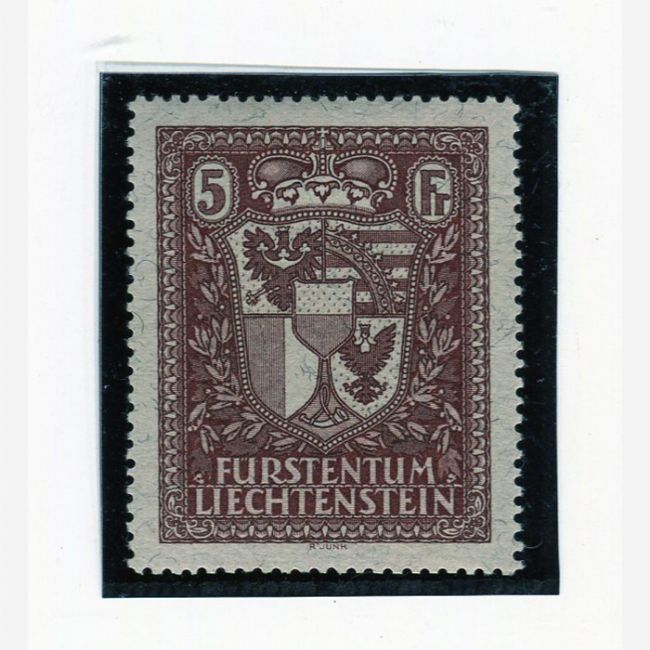 Liechtenstein 1934,francobolli da 5 Fr. bruno rosso, dentellatura 12, su carta con frammenti di fili di seta "ESPOSIZIONE FILATELICA DI VADUZ". Francobollo nuovo con gomma integra, correlato di certificato di garanzia CAFFAZ. e ENZO DIENA.