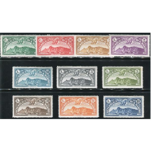 Repubblica di San Marino, posta aerea 1931 emissione filatelica "veduta di San Marino" serie composta da 10 francobolli nuovi con gomma integra. Valori dei francobolli: 50/80 centesimi, 1/2/2,60/3/5/7,70/9/10 lire.
