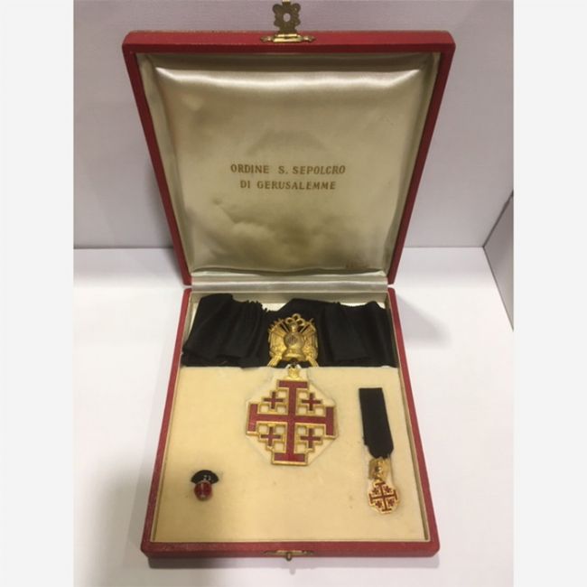Set completo con scatola originale dell'Ordine equestre Cavaliere del Santo Sepolcro di Gerusalemme, composto dal collare dell'ordine del santo sepolcro con croce, la Croce piccola dell'ordine e la rosetta in seta da occhiello. La croce di Gerusalemme dell'Ordine del Santo Sepolcro è smaltata di rosso, sormontata da un trofeo militare dorato con nastro in seta.