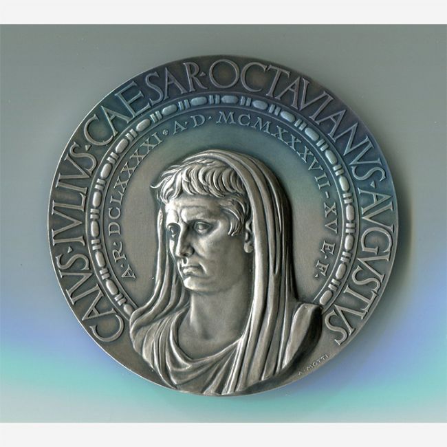 Medaglia di grande modulo in argento 986/1000 coniata per celebrare il Bimillenario di Caio Giulio Cesare Ottaviano Augusto, primo Imperatore Romano (63 a.c./14 d.c.). Al dritto della medaglia busto di Augusto con toga entro cerchio e perlinatura, intorno la scritta CAIVS IVLIVS CAESAR OCTAVIANVS AVGVSTVS entro cerchi A.R. DCLXXXXI A.D. MCMXXXVII XV E.F. nel della medaglia la raffigurazione della vista dei Fori Imperiali con il Colosseo sullo sfondo. Medaglia in argento 986/1000 - 82 mm. - Gr. 304,20 - Autore: Attilio Silvio Motti -