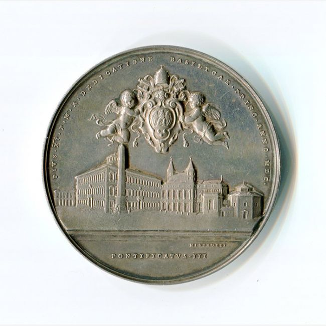 Pio XI (Achille Ratti) 1922-1924, medaglia straordinaria in argento anno III/1924 per celebrare il XVI° Centenario del complesso del Laterano. Al dritto della medaglia la raffigurazione dell'attuale complesso del Laterano e in alto due angioletti che sorreggono lo stemma pontificio, intorno in circolare: PIVS.XI.P.M.A. DEDICATIONE BASILICAE PRINC. ANNO.MDC. sotto MISTRUZZI / PONTIFICATVS. III. Al rovescio l'antico complesso del Laterano e in alto volto di Gesù tra le nubi, intorno in circolare: SACRA.SOLLEMNIA. SAECVLARIA.IESV.CRISTO.VICTORI sotto A.MDCCCCXXIV. AR. 144,20 Gr. / 70,50 mm.