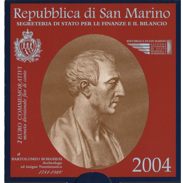 Moneta da 2 Euro commemorativo coniato dalla Repubblica di San Marnino a Bartolomeo Borghese anno 2004. Moneta divisionale in versione fior di conio.