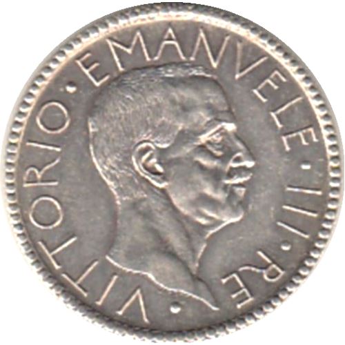 Moneta 20 Lire in Argento di Vittorio Emanuele III anno 1927 -Littore-, questa moneta fu coniata in sostituzione dei biglietti di Stato a corso forzoso. Nel rovescio della moneta è raffigurato il Littore con fascio littorio e l'Italia seduta che si appoggia su uno scudo crociato e sostiene una fiaccola, nel dritto della moneta effigie del Re Vittorio emanuele III. Contorno della moneta rigato. Zecca di Roma.