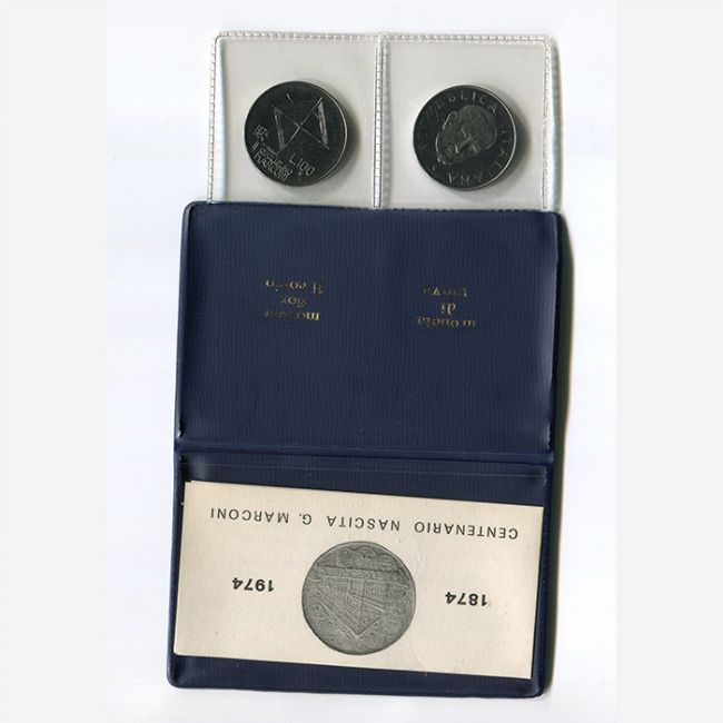 La moneta prova è confezionata in astuccio originale insieme ad un esemplare normale. Al dritto è raffigurata la testa di Guglielmo Marconi, al rovescio il ricevitore radio del 1926, la scritta PROVA è posta a destra sopra il valore L.100.