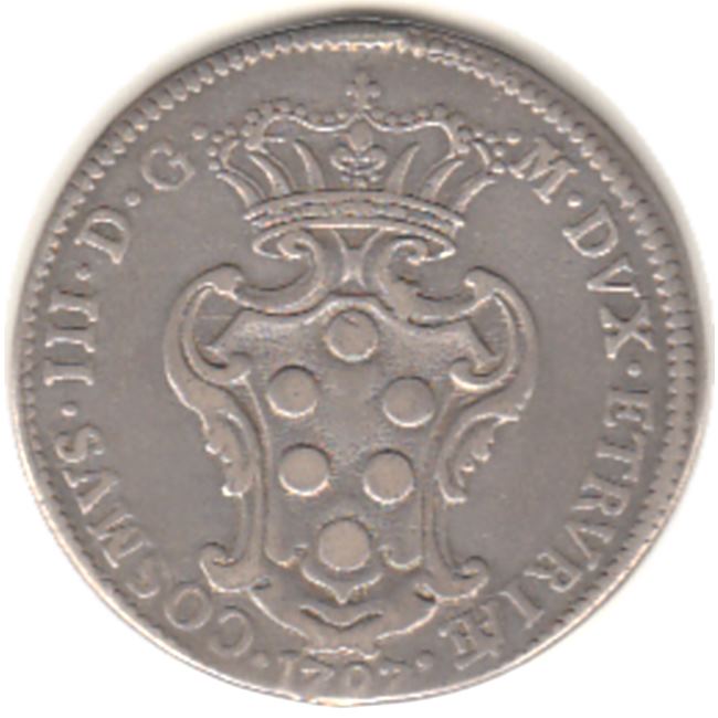 Toscana,Livorno, Cosimo III de Medici (1670-1723), Pezza della Rosa anno 1707, Argento, al dritto attorno alla moneta scritta COSMVS III D G M DVX ETRVRIAE, al rovescio GRATIA OBVIA VLTIO QVAESITA.