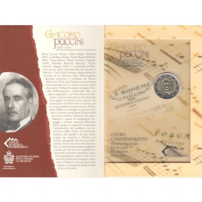 Repubblica di San Marino, emissione moneta divisionale fior di conio da 2 euro commemorativa anno 2014, 90° anniversario della scomparsa di Giacomo Puccini (1858-1924). I suoi lavori vennero rappresentati in Europa ed in America, il Maestro seppe coniugare l'eredità dell'ottocento, conferendo alle sue opere originalità e un forte senso comunicativo. Con lo stesso slancio ed ecletticità fu in grado di toccare tutti i generi, dal drammatico al mistico sino al comico, ma le sue peculiarità restarono quelle liriche, dove l'idillio, la nostalgia, la piccola vita a due e la morte costituiscono il fulcro dellla sua opera artistica.