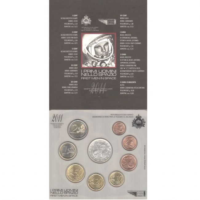 Serie Monete in Euro della Repubblica di San Marino 2011 versione fior di conio, dedicata ai Primi Uomini nello Spazio , la serie è composta da 1-2-5-10-20-50 centesimi di euro e da 1-2 euro e con la moneta da 5 euro in Argento 925/1000 dedicata ai primi uomini nello spazio. Nella moneta in argento in primo piano composizione con raffigurazione della rocca di San Marino, sul fondo il pianeta terra, a giro la legenda REPUBBLICA DI SAN MARINO. L'unione Sovietica riesce per prima ad inviare un eseere umano nello sapzio il 12 aprile 1961. A bordo della nave spaziale Vostok I, l'ufficiale JuriJ Gagarin (1934-1968) compie il primo volo orbitale attorno alla Terra, atterrando poi nella regione di Saratov.