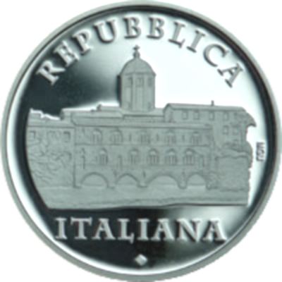 Moneta da 5 Euro in argento fondo specchio (proof) 925/1000 coniata dalla Zecca Polgrafico dello Stato della Repubblica Italiana anno 2014, tematica Italia delle arti "San Fruttuoso Liguria". Al dritto della moneta la raffigurazione dell'Abbazia di San Fruttuoso a Camogli (Genova), al rovescio della moneta particolare del chiostro inferiore dell'Abbazia di San Fruttuoso.