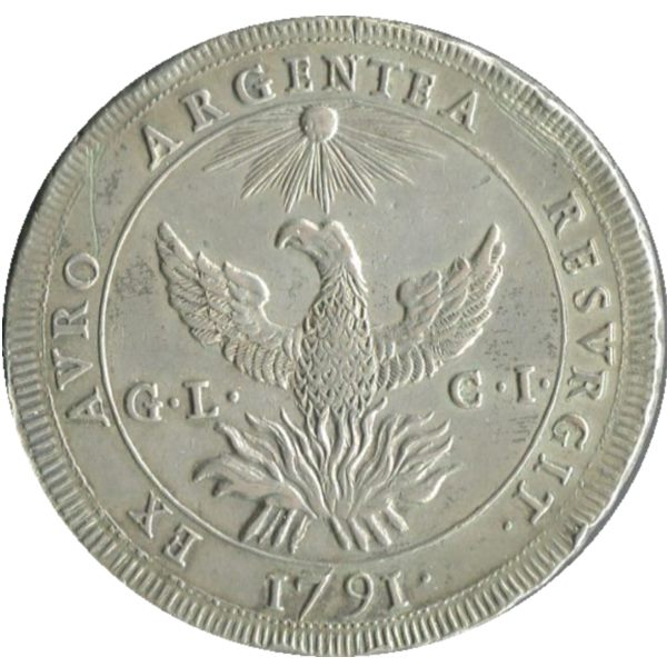 Ferdinando III di Borbone, Regno di Sicilia, Oncia da 30 Tarì anno 1791 zecca Palermo. Moneta coniata in argento, al dritto scritta: FERDINANDVS.D.G.SICIL.ET.HIER.REX con busto corazzato a destra con lunga capigliatura che occupa tutto il campo, al rovescio: EX AVRO ARGENTEA RESVRGIT 1791, la fenice con ali spiegate sulle fiamme, entro cerchio lineare, illuminata da sole raggiante con volto umano. Figlio di Carlo III e Maria Amalia, Ferdinando III nacque a Napoli nel 1751 e salì al trono all'età di 8 anni, succedendo al padere che era salito sul trono di Spagna.