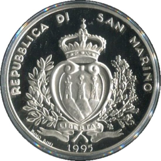 Moneta in argento .835 in versione fondo specchio (proof) coniata dalla Repubblica di San Marino anno 1995 dedicata alle Olimpiadi di Atlanta del 1996. Moneta confezionata in astuccio.