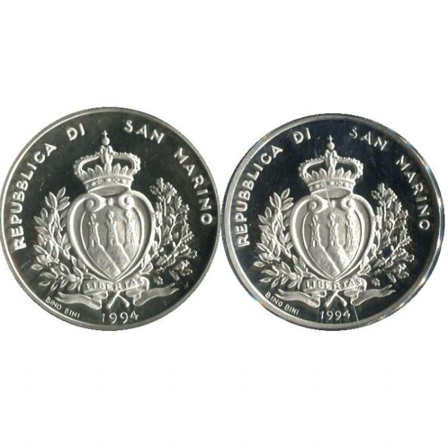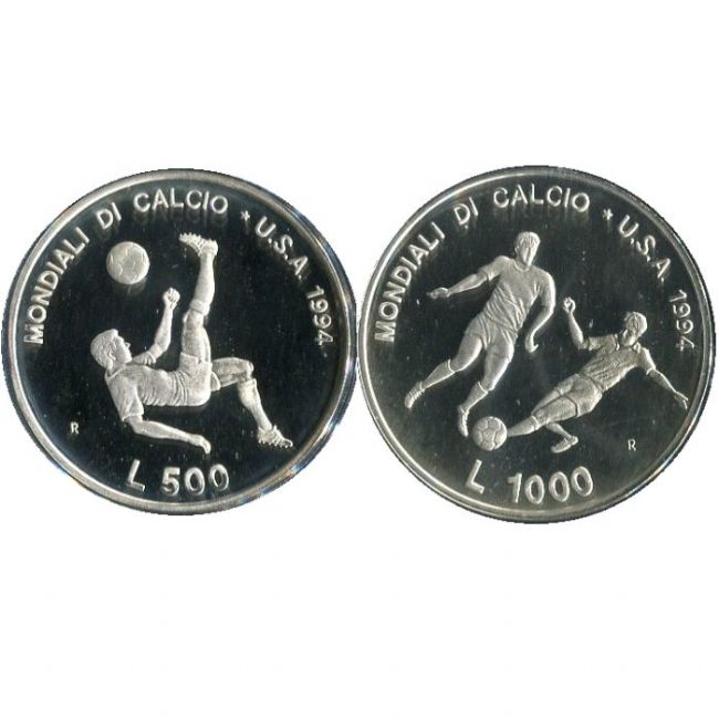 Dittico di Monete rispettivamente da 500 e 1000 lire in argento .835 in versione fondo specchio (proof) a commemorare il campionato di calcio svoltosi negli Stati Uniti d'America nel 1994. Le monete sono riunite e confezioneta nel loro astuccio.