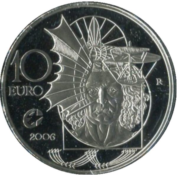 Moneta da 10 euro commemorativa a Leonardo da Vinci coniata dalla Repubblica Italiana anno 2006 in argento .925 versione fondo specchio (proof). La moneta al dritto presenta il ritratto di Leonardo e al rovescio immagini di elementi di disegni. Moneta confezionata in astuccio.