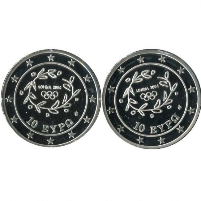 Grecia, emissione dittico di monete commemorative Olimpiadi di Atene 2004 da 10 euro in argento .925 versione fondo specchio -proof-. Le monete raccolte nel loro astuccio al dritto riproduco l'immagine dell'atleta moderno e di quello antico nell'atto della corsa e del lancio del disco, al rovescio hanno il logo delle Olimpiadi.