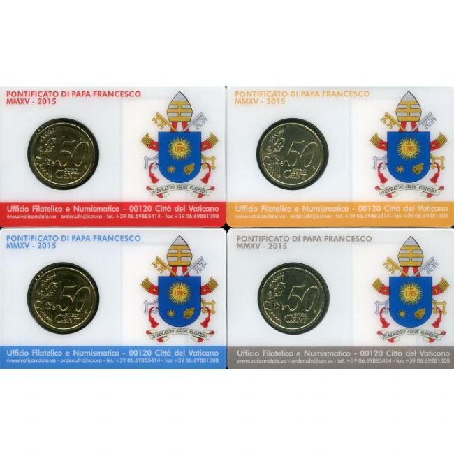 Emissione filatelico-numismatica della Città del Vaticano -Stamp e Coin card- anno 2015 composta da 4 blister contenenti ognuno una moneta da 50 centesimi e un francobollo entrambi con l'immagine di sua Santità Papa Francesco. I valori facciali dei francobolli sono da 0,80-0,95-2,30-3,00.