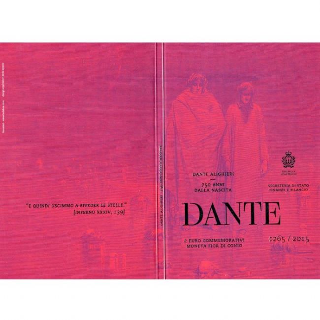 Moneta da 2 euro commemorativa emessa dalla Repubblica di San Marino nel 2015 dedicato al 750 anniversario della nascita del sommo Poeta, al dritto della moneta il profilo di Dante tratto da un affresco del Botticelli.