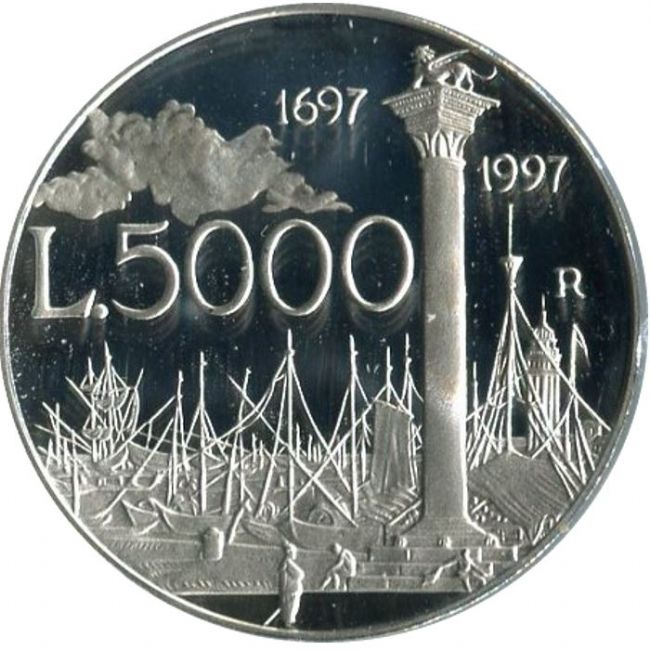 Moneta da 5000 lire in argento 835% emessa nel 1997 dalla zecca poligrafico dello stato dedicato al 300° anniversario della nascita di Canaletto in versione fondo specchio (proof).Al dritto della moneta ritratto di Canaletto e firma sullo sfondo di Venezia, al retro particolare del dipinto del Canaletto: il bacino di San Marco.