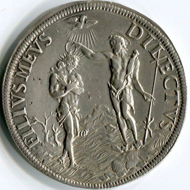 Al rovescio, nel campo della Piastra scena del battesimo di Gesù Cristo, intorno la scritta FILIVS MEVS DILECTVS.