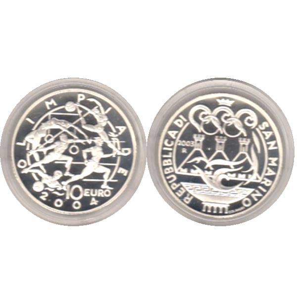 Emissione dedicata alle Olimpiadi di Atene del 2004 con un dittico di monete in Argento proof. Le monete coniate dalla zecca della Repubblica di San Marino sono composte da una moneta di 5 euro e una moneta di 10 euro in versione fondo specchio. Nel rovescio della moneta da 5 €. è raffigurato il partenone e gare della prime olimpiadi nel rovescio della moneta da 10 €. è raffigurato simboli dei giochi odierni. Le monete sono raccolte nel loro cofanetto.